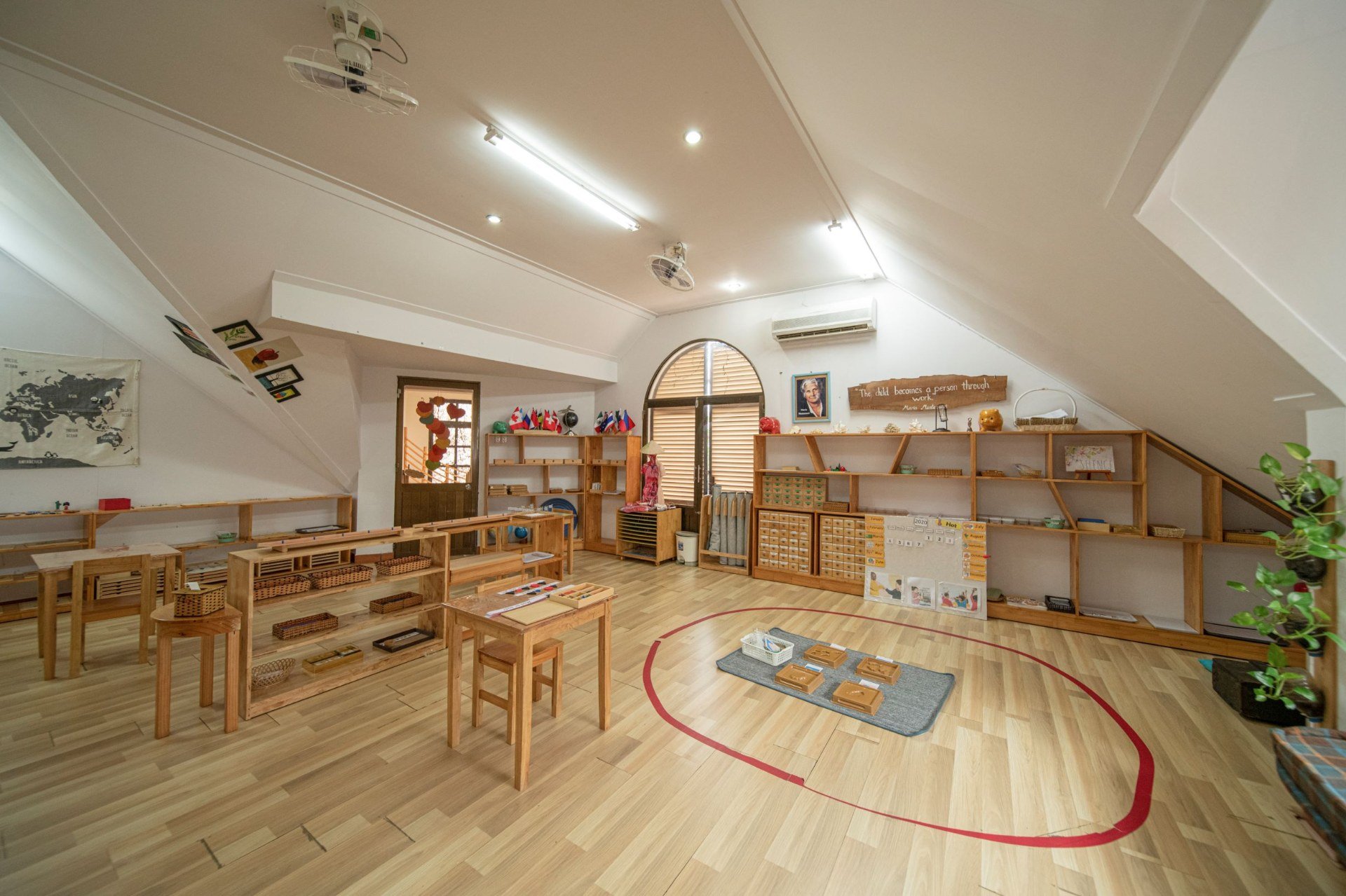 Không gian lớp học rộng rãi, thoáng mát, sạch sẽ. Học cụ đa dạng, trực quan và an toàn với trẻ.